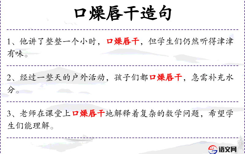 句子:“长途跋涉后,探险队员们个个口燥唇干,急需找到水源。”