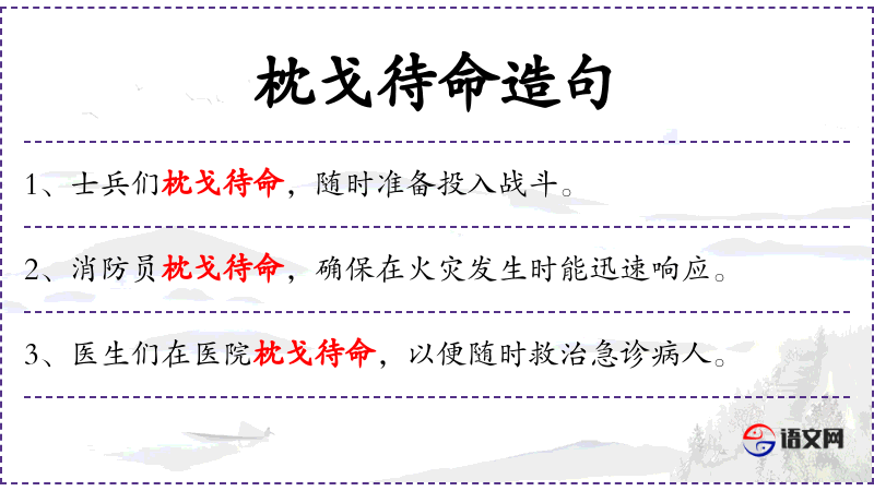 1. 【枕戈待命】 - 枕着武器等待命令。形容时刻准备战斗。