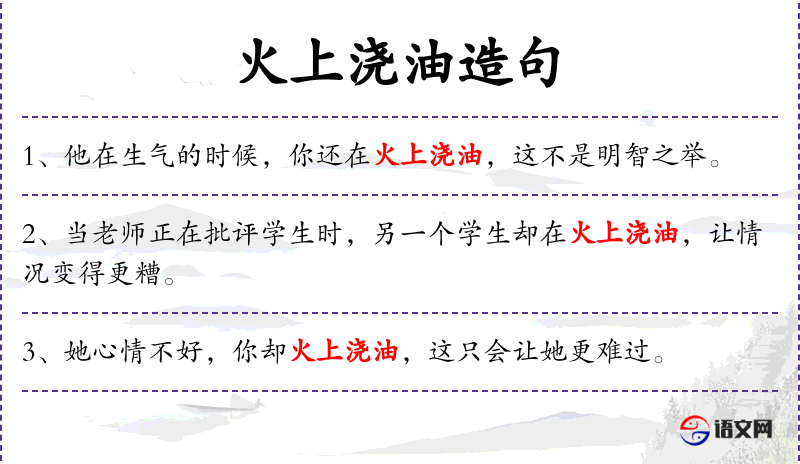 5. 【火上浇油】 - 往火上倒油。比喻使人更加愤怒或使情况更加严重。
