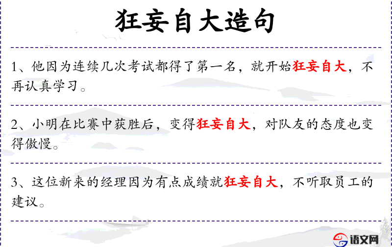 7. 【狂妄自大】 狂妄:极端的自高自大。指极其放肆,自高自大,自中无人。