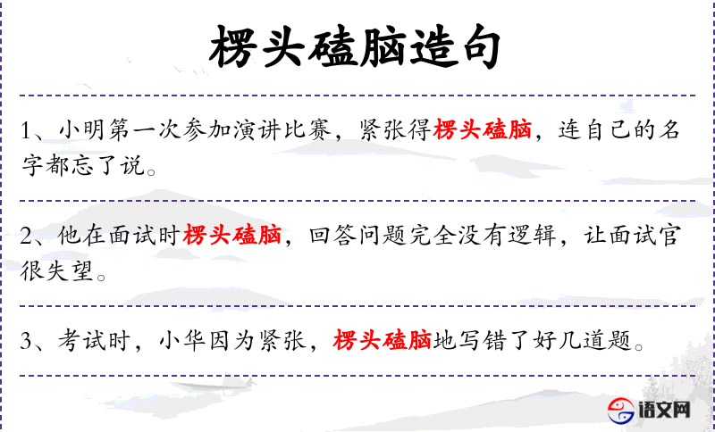 3. 【楞头磕脑】 - 形容鲁莽冒失或傻呵呵的样子。也形容发楞发呆的样子。同“楞头楞脑”。