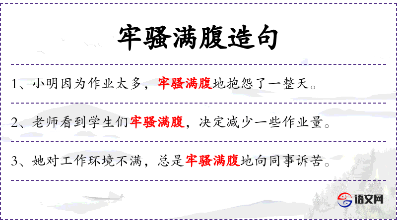 3. 【牢骚满腹】 指人的一肚子委曲、不满的情绪。