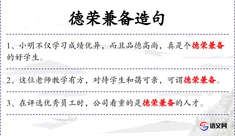 - 德荣兼备:品德和荣誉都具备,形容人品高尚且受人尊敬。