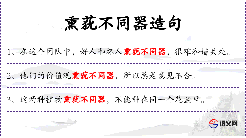 2. 【熏莸不同器】 - 熏莸:香草和臭草。比喻好和坏不能共处。