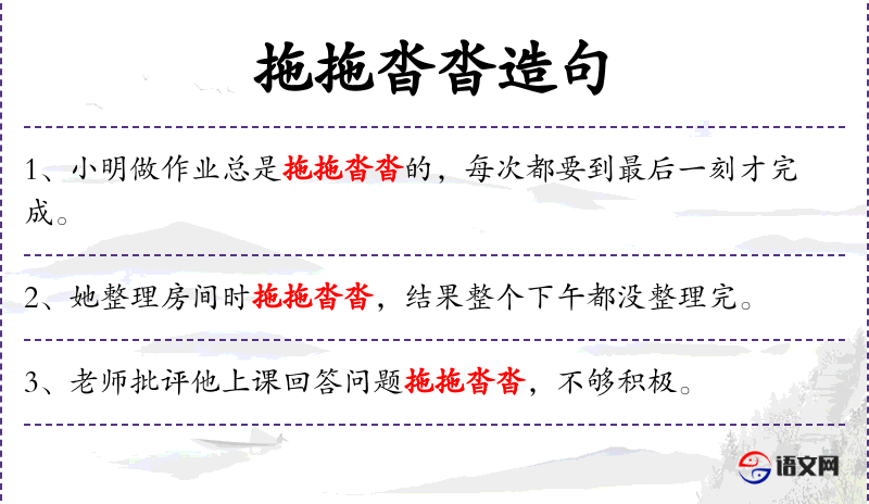 - 状语:“拖拖沓沓”是状语,修饰谓语,说明动作的方式。
