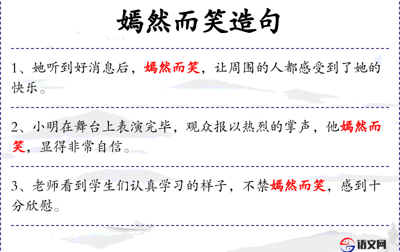 - 定语:嫣然而笑的