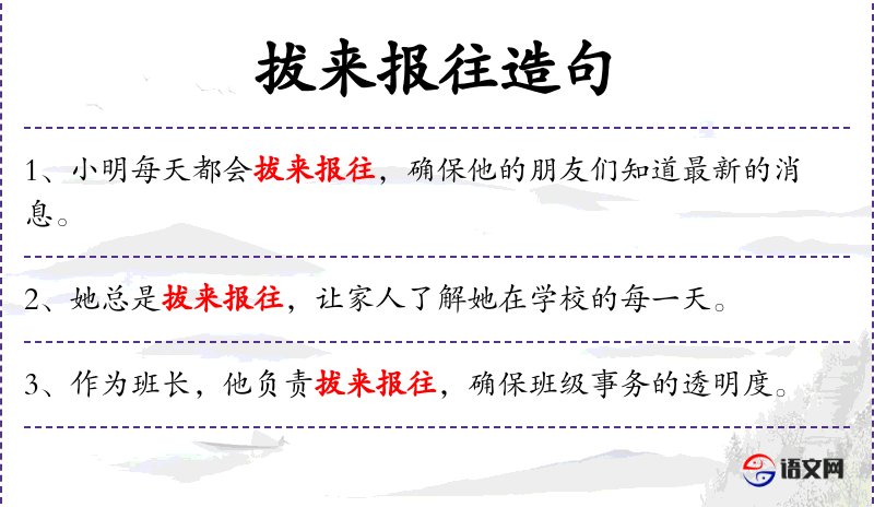 “拔来报往”是一个成语,源自古代传递消息的方式,这里用以比喻班长处理和传达班级事务。这个成语的使用体现了对传统文化的尊重和运用。