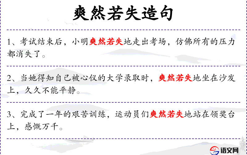 5. 【爽然若失】 爽然:主意不定的样子;若失:象失去依靠。形容心中无主、空虚怅惘的神态。