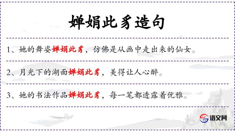 - 日文:彼の詩の句は、美しい「婵娟此豸」のように、古典的な風情に満ちている。
