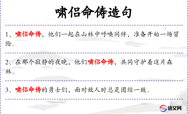 - 啸侣命俦:这是一个成语,意为呼唤伴侣,召唤朋友。这里的“啸”指的是呼唤,“侣”和“俦”都是指朋友或同伴。