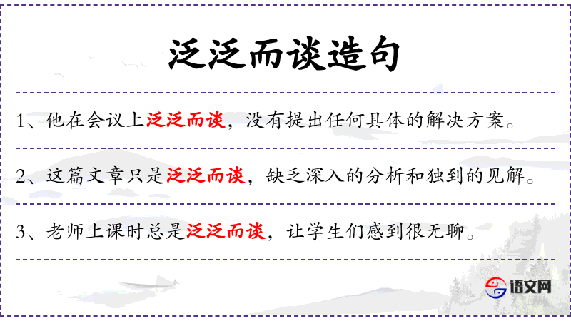5. 【泛泛而谈】 泛泛:平常,不深入。一般地浮泛地谈谈。