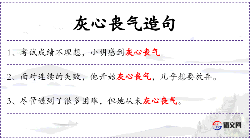 3. 【灰心丧气】 灰心:心如熄灭了的死灰;丧:失去。形容因失败或不顺利而失去信心,意志消沉。