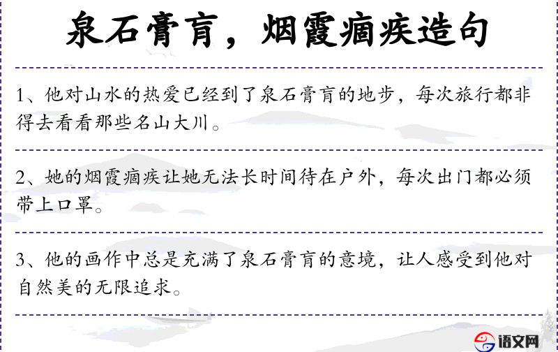 2. 【烟霞痼疾】 - 烟霞:指山水;痼疾:久治不愈的病,比喻积久成习,不易改变的嗜好、习惯。指爱好山水成癖。