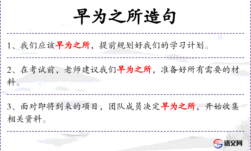 - 早为之所:early preparation (英), 早めの準備 (日), frühzeitiger Vorbereitung (德)