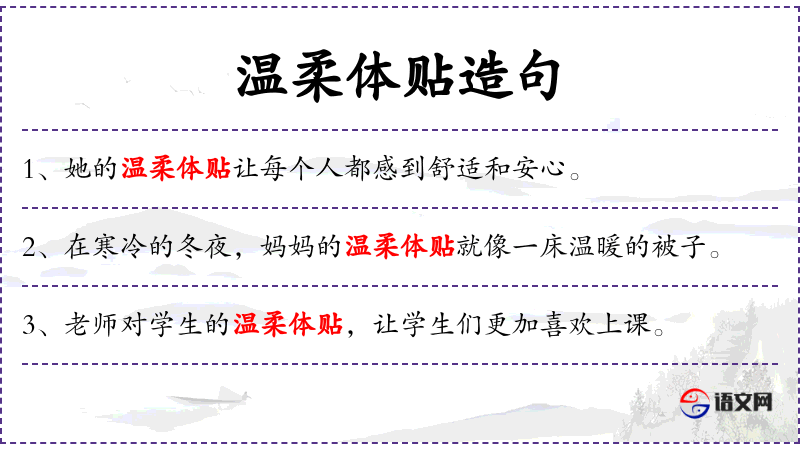 1. 【温柔体贴】 - 温顺关怀体贴。