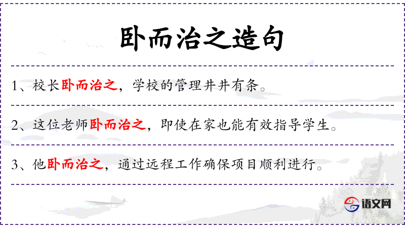 - 卧而治之:成语,意为“躺着就能治理”,形容管理得当,无需过多操劳。