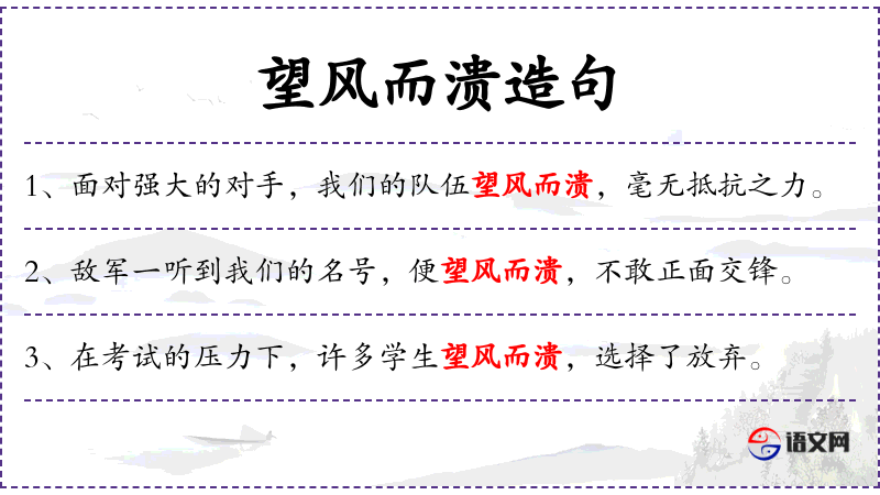 2. 【望风而溃】 - 远望敌人踪影就已吓得溃散。形容军队毫无战斗力,还未接触,就已溃散。