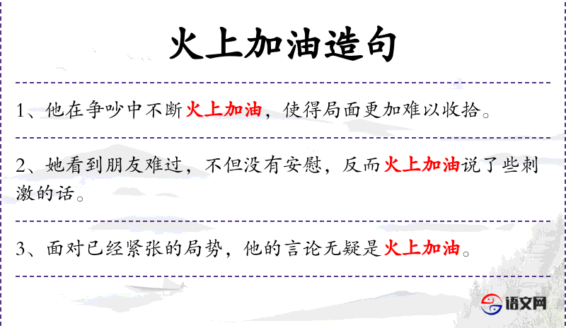 1. 【火上加油】 - 在一旁助威增加他人的愤怒或助长事态的发展。