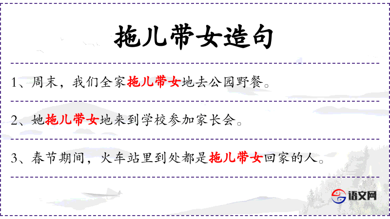 - 拖儿带女:这个词组形象地描述了家庭成员一起出行的情景。