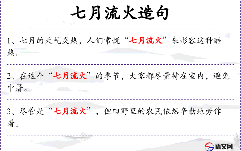1. 【七月流火】 火:星座名,即心宿,每年夏历六月出现于正南方,位置最高,七月后逐渐偏西下沉,故称“流火”。指夏去秋来,寒天将至。