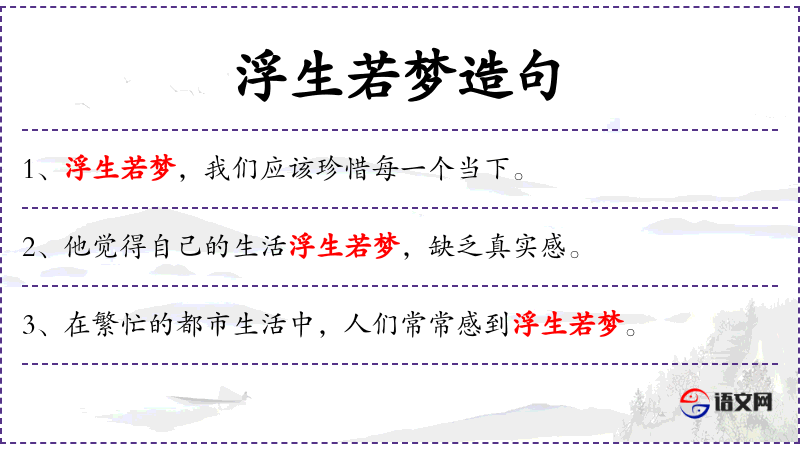 1. 【浮生若梦】 - 浮生:空虚不实的人生;若:象。把人生当作短暂虚幻的梦境。