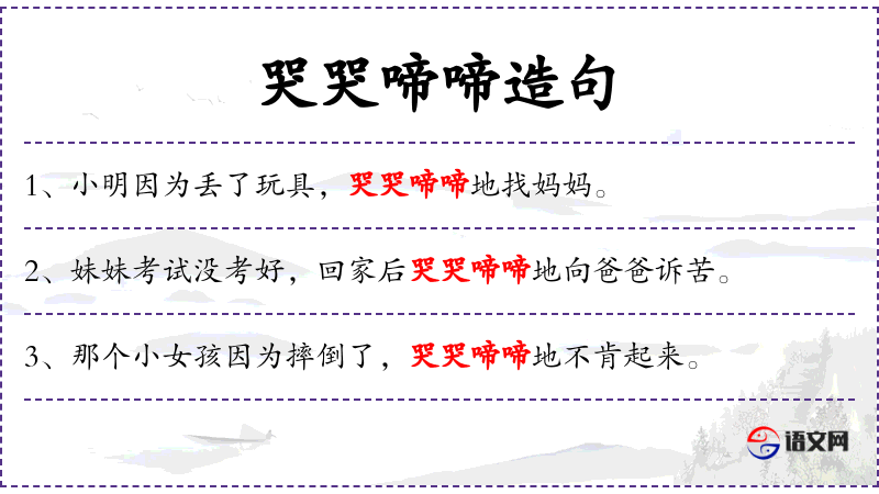- 哭哭啼啼:形容词,形容哭泣的声音或状态。