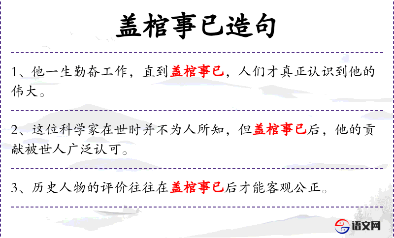 4. 【盖棺事已】 盖:遮盖;已:停止。人死了,事情才算完结。泛指终身坚持或追求某种事业。