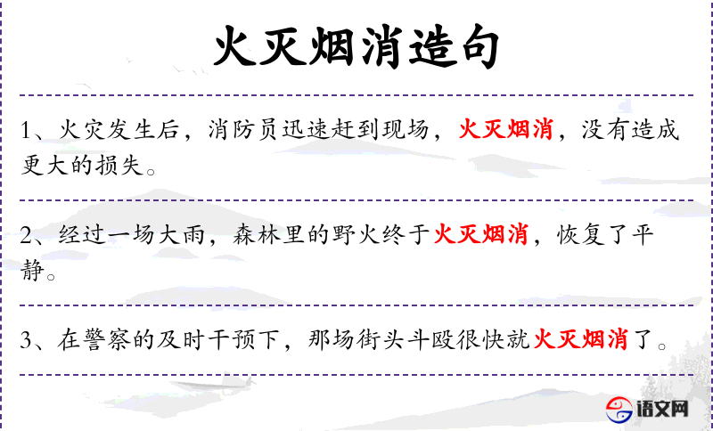 4. 【火灭烟消】 火苗熄灭,烟云消散。比喻事物消失净尽,不留一点痕迹。亦作“烟消火灭”。