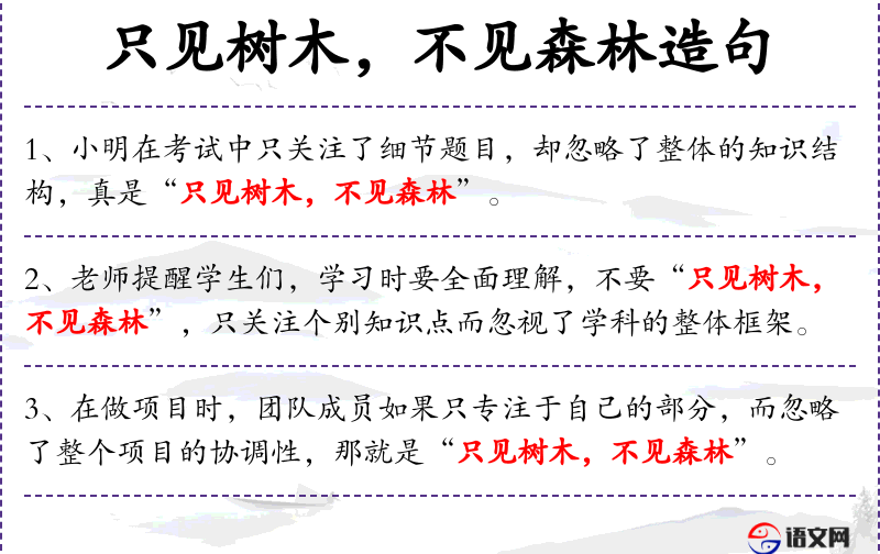 - 文化意义:“只见树木,不见森林”是**传统文化中的一个成语,强调从整体和宏观的角度看待问题。