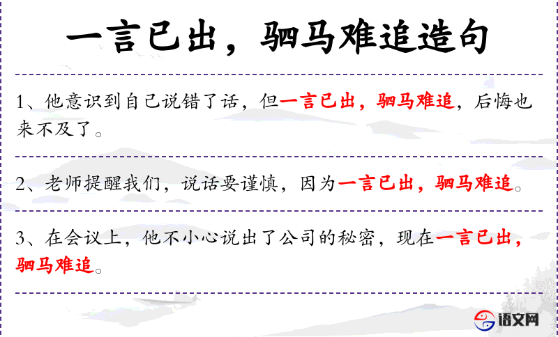 1. 【驷马难追】 一句话说出了口,就是套上四匹马拉的车也难追上。指话说出口,就不能再收回,一定要算数。