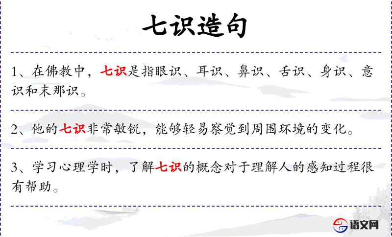 1. 【七识】 佛教语。法相宗谓从根本识中派生的七种精神和感觉现象,即眼﹑耳﹑鼻﹑舌﹑身﹑意﹑末那。亦称七转识。
