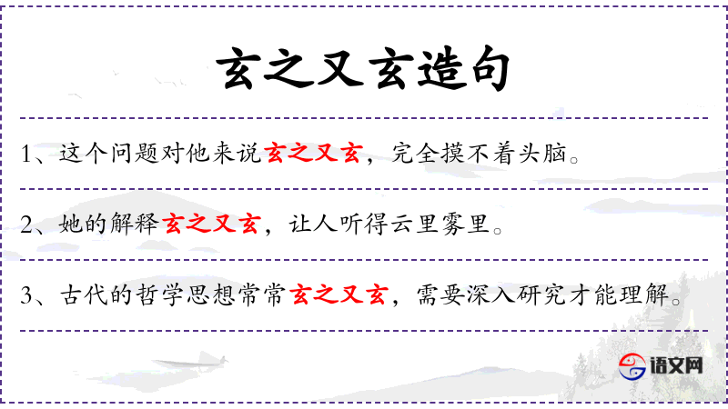 1. 【玄之又玄】 - 原为道家语,形容道的微妙无形。后多形容非常奥妙,不易理解。