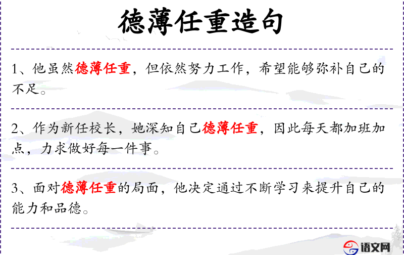 - *德任重**:成语,表示品德不高但责任重大。