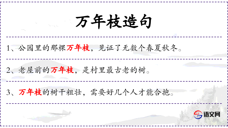 树名。即冬青。南朝齐谢杋《直中书省》诗"风动万年枝,日华承露掌。"唐上官仪《咏雪应诏》"幸因千里映,还绕万年校。"宋吴曾《能改斋漫录.沿袭》"万年枝,江左谓之冬青。"一说即檍木。见明杨慎《丹铅总录.花木》; 指年代悠久的大树。