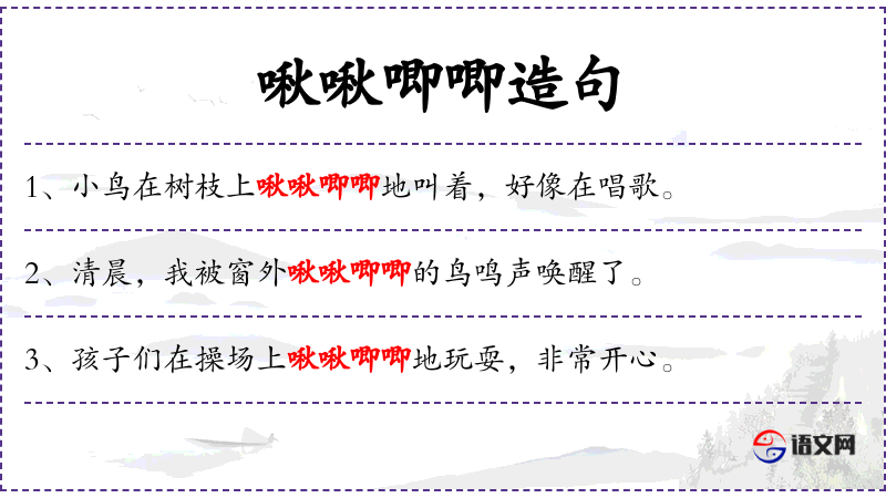 - 啾啾唧唧:模拟鸟叫声的拟声词。
