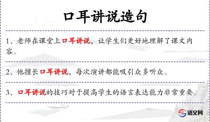 - 在课堂上,老师口耳讲说,使得学生们对课文内容有了更好的理解。