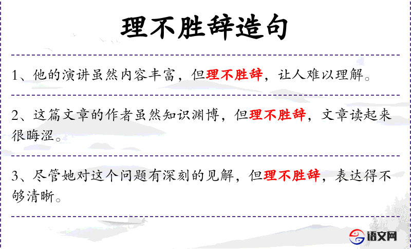 5. 【理不胜辞】 道理不能胜过文辞。指由于不善于推理立论,尽管文辞丰富多彩,道理并不充分。