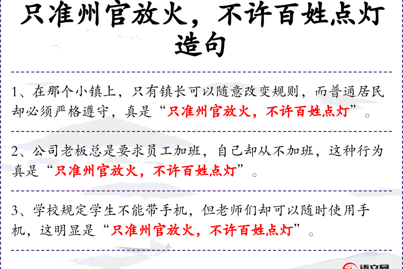 句子中的成语“只准州官放火,不许百姓点灯”源自**古代,反映了古代社会中权力不平等的现象。这个成语在现代汉语中仍然被广泛使用,用于批评不公平的社会现象。