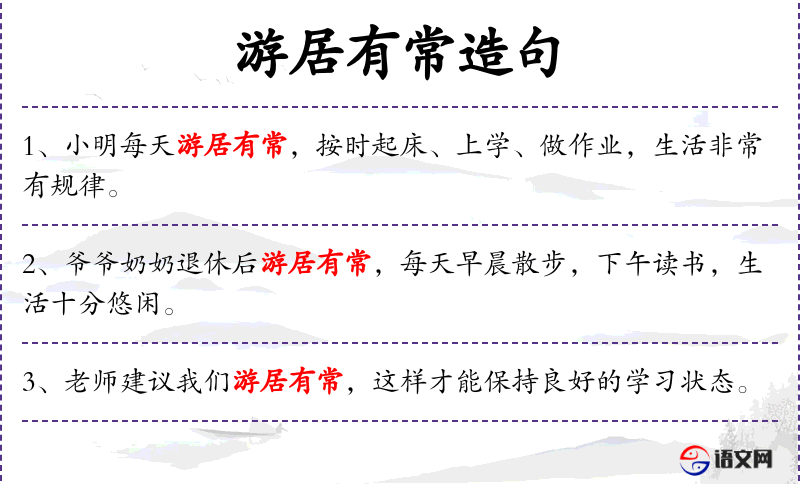 1. 【游居有常】 - 常:正常,常规。外出或家居都要遵守常规。