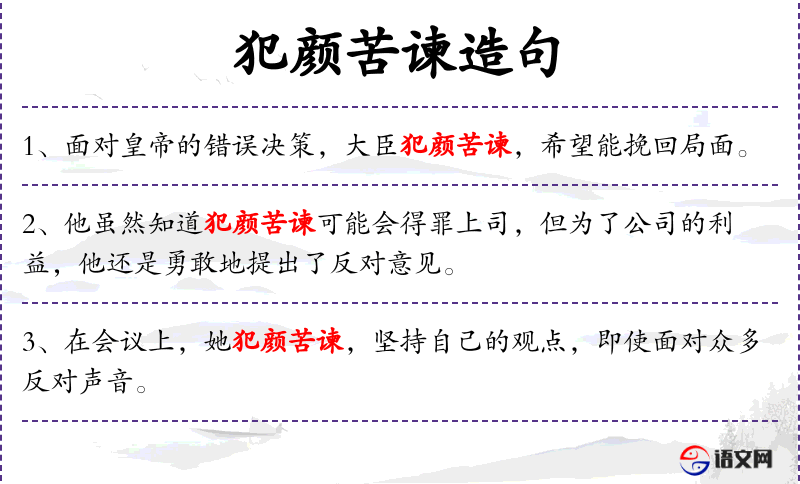 7. 【犯颜苦谏】 犯颜:冒犯君主或尊长的颜面、威严;苦谏:苦苦规劝(常用下对上)。敢于冒犯君主或尊长的威严而极力规劝其改正错误。
