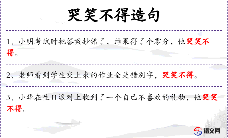 - 得了个零分:动词短语,表示考试结果。 *. 哭笑不得:成语,表示既感到难过又感到无奈。