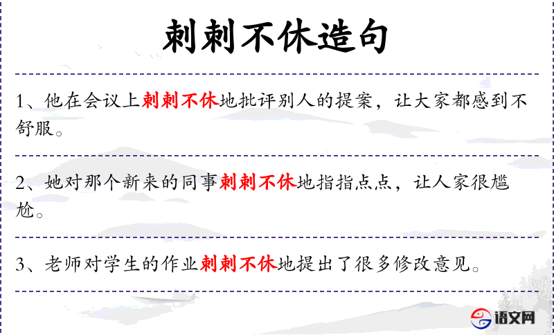 - 刺刺不休地:副词,形容说话连续不断,带有负面色彩。