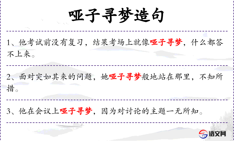 - 哑子寻梦:比喻在某种情境下感到无助或迷茫,不知道如何行动。