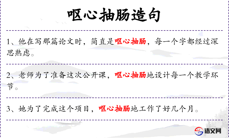 句子中的“呕心抽肠”是一个成语,源自**传统文化,形容做事非常用心和费力。这与西方文化中类似的表达如“go the extra mile”或“spare no effort”有相似之处。
