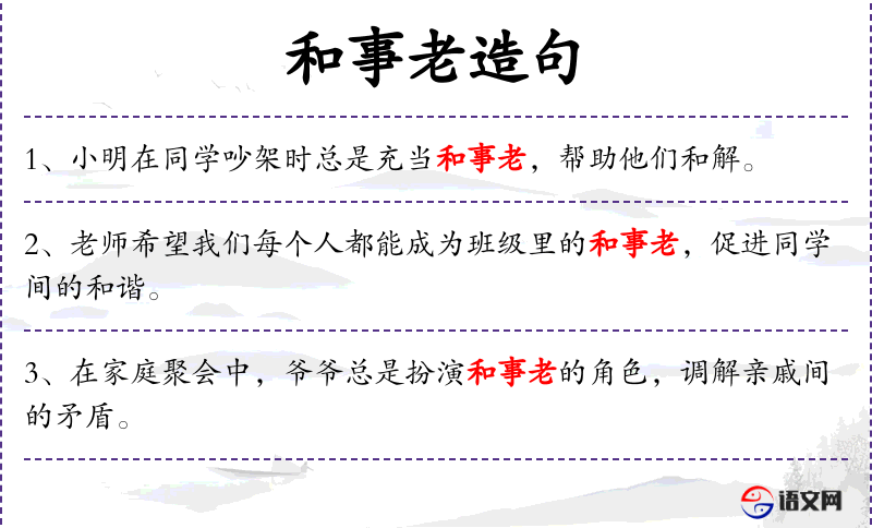 - 和事老:指调解纠纷的人,通常指那些试图平息冲突或争议的人。