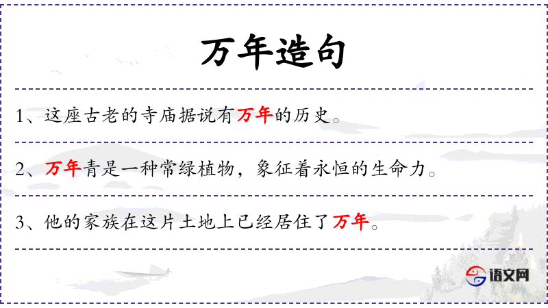 1. 【万年】 祝祷之词。犹万岁;长寿; 极言年代之久远; 死的婉辞; 木名。