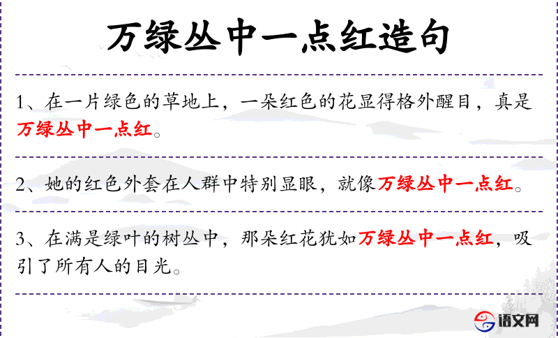 1. 【万绿丛中一点红】 - 大片绿叶丛中有一朵红花非常醒目。比喻在众多事物中突出最精采的一点,足以引起人们的注意。