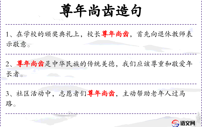 句子:“学校教育我们要尊年尚齿,尊重每一位老师的辛勤付出。”