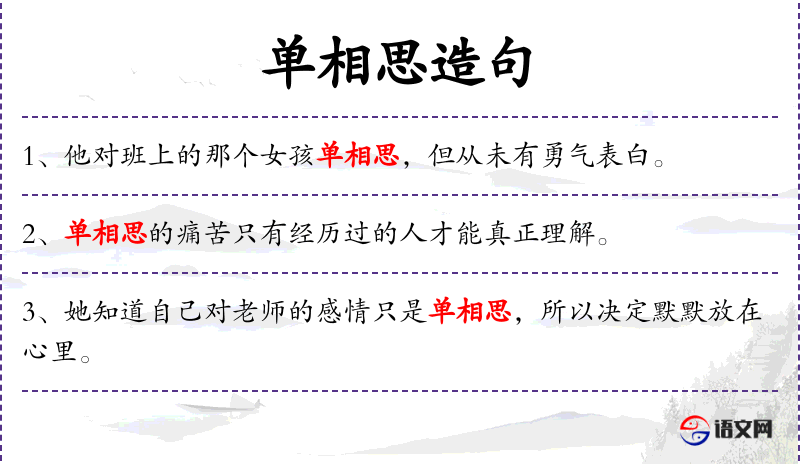 - 单相思:名词,指单方面的爱慕或暗恋。