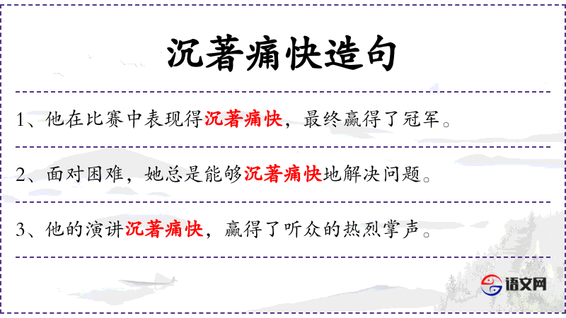 3. 【沉著痛快】 - 坚劲而流利,遒劲而酣畅。形容诗文、书法遒劲流利。